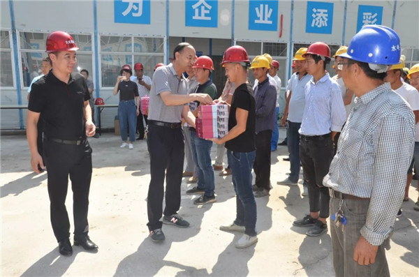 林州市總工會主席栗旺生詳細了解了項目進展和工人們的生產生活情況,并作重要講話。林州市委市政府長期以來一直非常關心一線建筑工人,林州市總工會持續開展深入建筑施工現場慰問活動,為廣大工作在生產一線的農工朋友們送上節日的關懷與問候,對堅守在一線的建筑工人表示慰問和感謝,對他們所付出的努力和取得的成績表示充分肯定,將體恤衫、中秋月餅和蘋果等慰問品發放到工人們手中,并參觀了施工現場、職工食堂和宿舍。他強調,一線建筑工人要牢固樹立“安全第一”的思想意識,切實保障職業健康和人身安全;項目部要深入開展技能培訓,助推工人技能提升,豐富工人的業余生活,不斷改善建筑工人工作和生活環境,做好后勤保障。