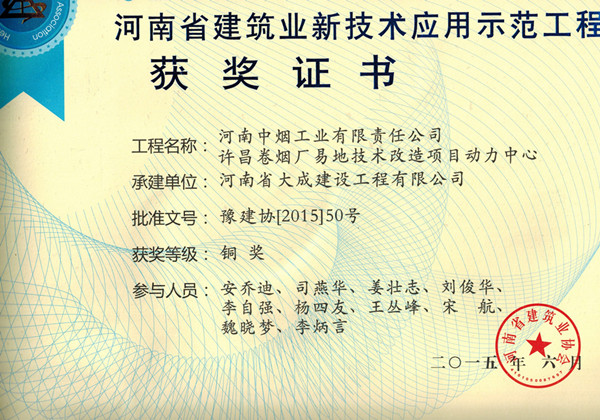 日前,從河南省建筑業協會獲悉,由我集團公司承建的河南中煙工業有限責任公司許昌卷煙廠易地技術改造工程符合河南省建筑業新技術應用示范工程驗收要求,經河南省住房和城鄉建設廳研究決定,授予本項目“河南省建筑業新技術應用示范工程獎”。